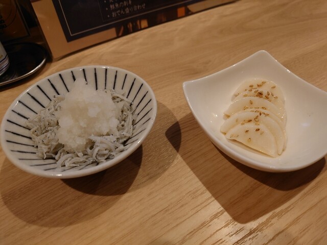 ほんのおつまみ程度の小鉢もありまして、そちらから山芋ナムルとシラス鬼おろしを注文。