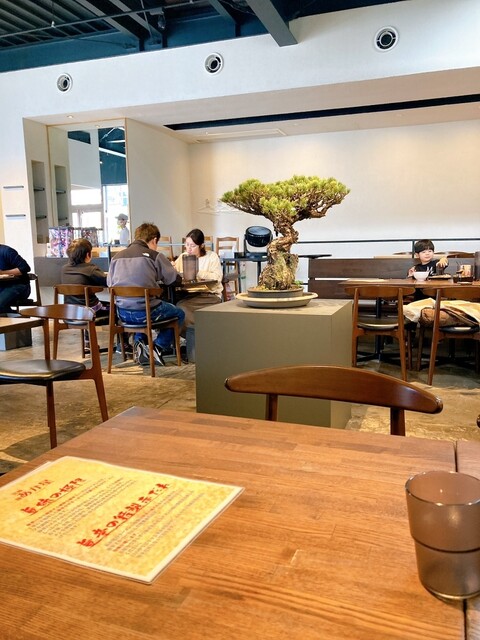 おしゃれなカフェ風の店内にはなぜか盆栽笑笑
