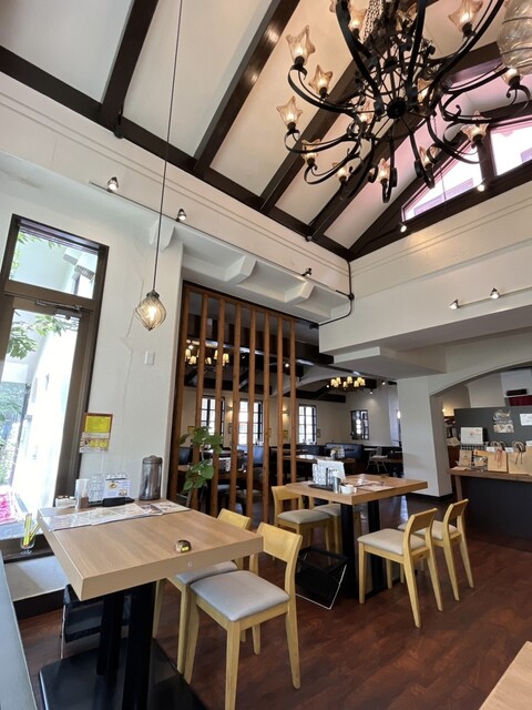 赤と白の外観がぱっと目を引く店構え。店内は明るくカジュアルで、テーブル席とカ...
