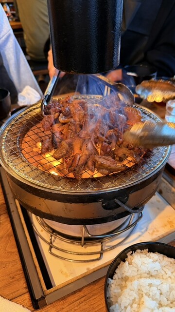 テーブル席に焼き台があり、炭火にて醤油ベースの秘伝のタレに漬け込まれ...