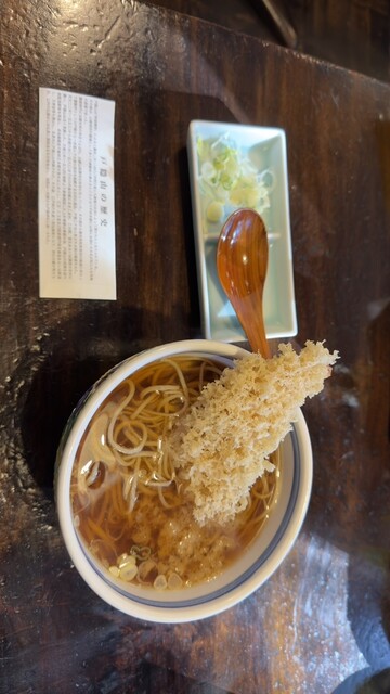 醤油ベースの温かい蕎麦と海老天ぷらは、香ばしい香りと深い旨みが魅力です。湯気とともに立ち上る醤油の香りが食欲をそそり、出汁と醤油が一体となったつゆは体をぽかぽかと温めます。蕎麦は程よい歯ごたえで、醤油...