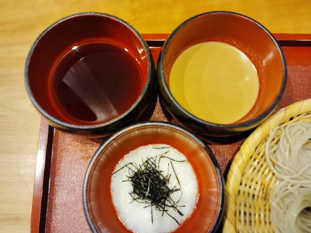 ・「そば三昧」1700円・・ワサコオーダー。つけ汁は通常のそばつゆ、とろろ、胡桃ダレの3種。ついて来た徳利のツユはとろろに入れて好みの濃さにします。こちらは6ぼっち。胡桃は濃厚。とろろはまぁ普通。やっぱりノーマルのツユが一番好きかな(笑)あっという間に食べ終えた旦那さんに1ぼっちあげる♪蕎麦湯はサラリとしたタイプ。雰囲気、接客、蕎麦ととても良かった。