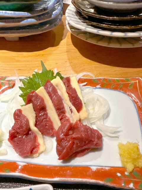 初めて利用。 別の目当て店が休業していたのでこちらへ。 予約なしで入れたが、2〜3卓しか空いていなかった模様。 すぐに満席。 まず、馬刺盛り、長芋竜田揚げ、野菜スティック、 串焼盛り合わせなど。 馬刺は赤身、たてがみ、レバー。 レバーは初めて食べた。おいしい。 長芋は薄切りかと思いきや半月状。 ホクホク、サクサク。 追加で、野沢菜天ぷら、鮪レアカツなど。 ... 詳細を見る