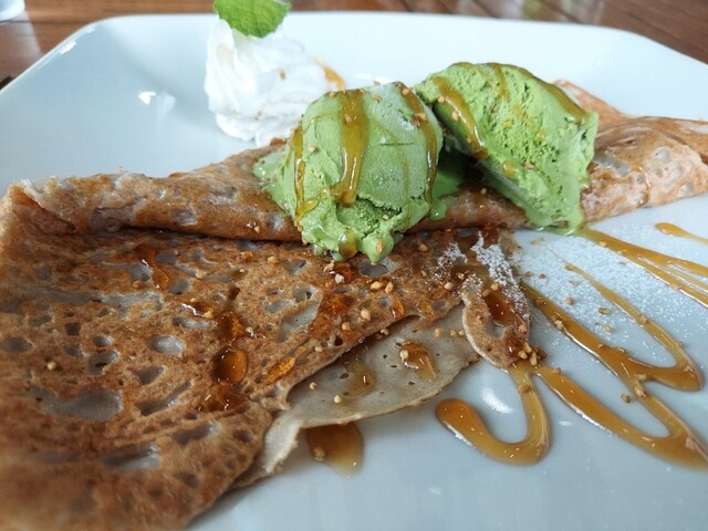 地元の新鮮な食材や自然食材を使ったメニューが人気です。そば粉を100%使用したガレットは、ご注文をいただいてから1枚づつ手焼きします。ランチにピッタリなそば粉の風味をしっかり味わえるシンプルな「ハムとチーズのガレット」やデザート系ガレットが好評です。他にも、地元産野菜を存分に味わえるコンソメスープ「季節野菜のペイザンヌスープ」もおススメ。ワンちゃん同伴もOK。屋根付きBBQハウスも併設。