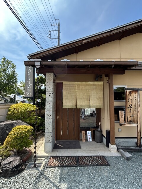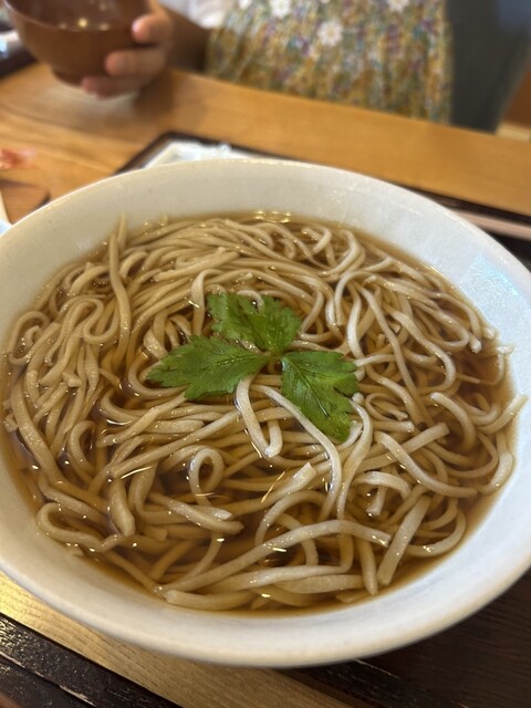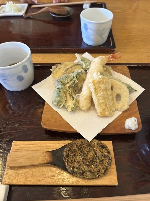 休日の不在者投票を終えてランチ利用で訪問しました。11時半を回ってましたが運良く駐車スペースが有り訪問しました。テーブル席に案内されてオーダーしたのは季節限定冷かけそば@1200円にしました。冷かけそばには信州の郷土野菜の丸ナスの素揚げが四枚乗っています。ミョウガのカットした物も乗っていて清涼感が有ります。