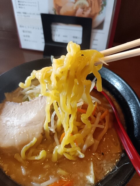 着丼。小さな野菜などが浮く。スープは、味噌がダイレクトに感じるタイプ。個人的には、もう少しコクが欲しい。麺は、太くて縮れていて透明感のある丸いもの。ワシワシと食べる感じは楽しいし旨い。チャーシュー...