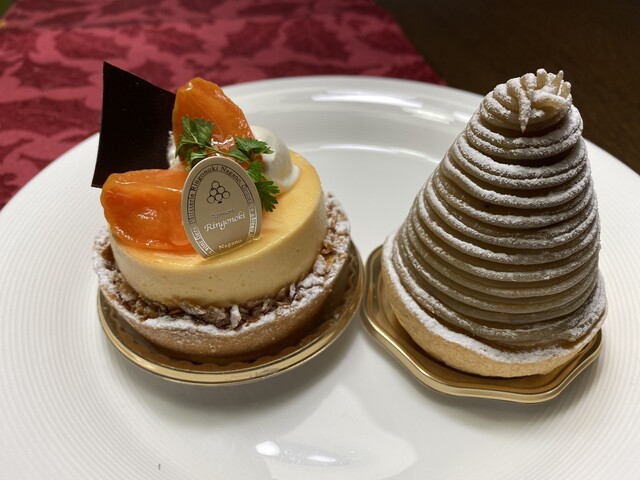 お店の中に入るとショーケースの中にはいつものケーキのほか、おいしそうな色でぐるぐる巻きになったモンブランと、名前を忘れてしまったのですが色彩豊かで杏を使ったケーキが目立ちましたので、その二つを買って帰りました。