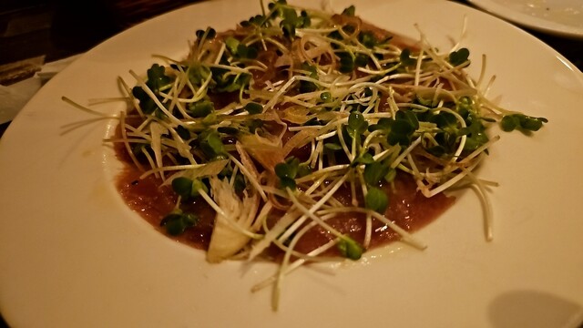 牛タンのカルパッチョは薄く柔らかく、かけられた玉ねぎみじん切りとピンクペッパーがいい仕事してます。