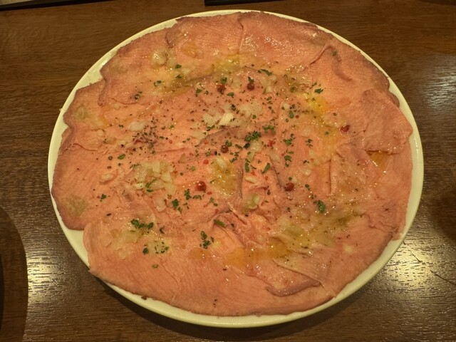 牛タンのカルパッチョは薄く柔らかく、かけられた玉ねぎみじん切りとピンクペッパーがいい仕事してます。