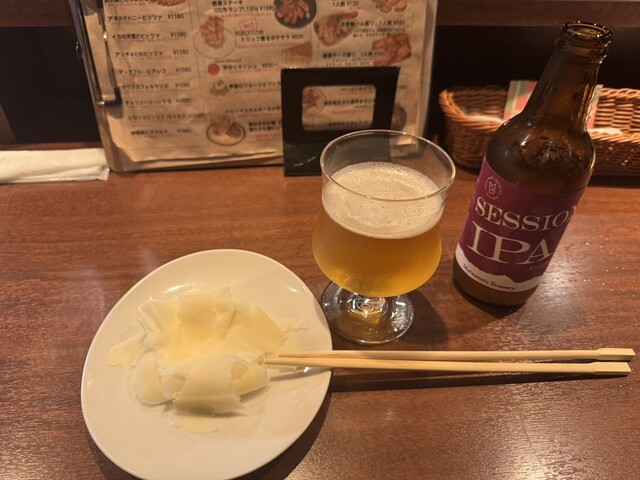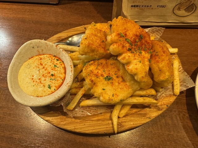 牛タンのカルパッチョとフィッシュ&チップス、きのこのキッシュ、ビール、溢れスパークリングを頼みました。