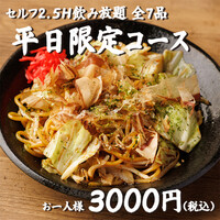 本日のお造り・箸で食べる焼き鳥・自家製唐揚げ・ホルモン焼きそばなどのお料理全7品に、最大2.5H飲み放題付きの平日限定コース!会社の宴会や女子会、合コンなど幅広いシーンにオススメです!