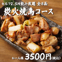 本日のお造り・地鶏たたき2種・箸で食べる焼き鳥・自家製唐揚げ・ホルモン焼きそばなどのお料理全8品に、最大2.5H飲み放題付きの炭火焼鳥コース!会社の宴会や女子会、合コンなど幅広いシーンにオススメです!