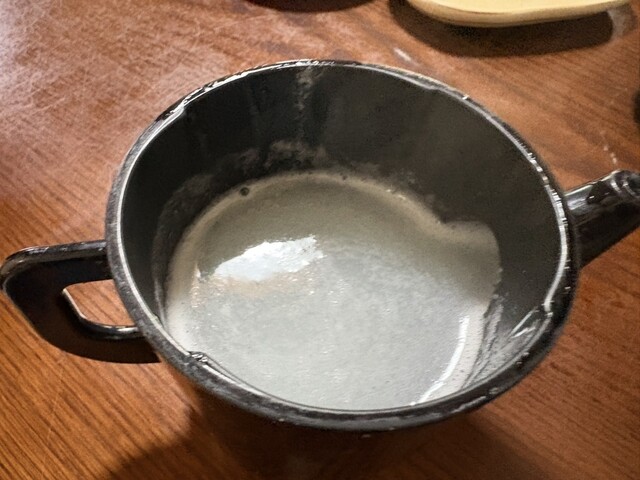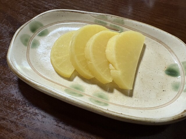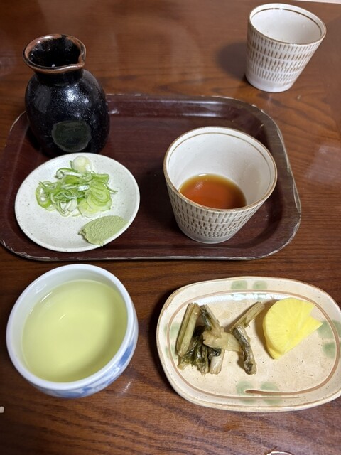 さて、店内も田舎の家の広間に通された感じ。お茶と漬物を出されました。美味しい野沢菜と沢庵です。