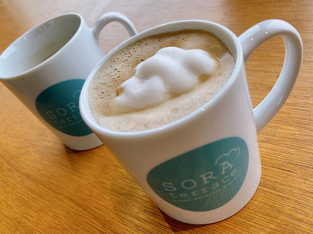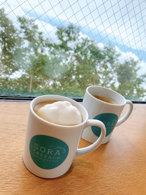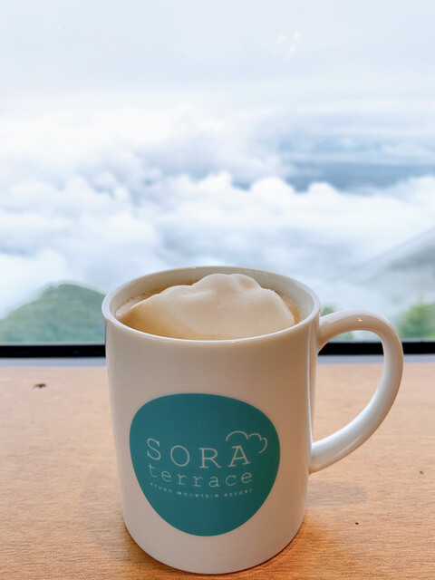 着くとそこには素晴らしい景色が!と思いきやお天気悪く曇り。晴れていたら絶景だと思います。とりあえずお店に入り、かわいい雲のコーヒーを注文。マグカップ付き(1200円)とそうでないもの(650円)があり、そうでないものは紙のコップでの提供、マグカップいらんな…(-_-;)でもせっかく来たのでマグカップ付きに。店員さんが少なく、洗うことができないから買い取りの仕組みなのか?と思いましたが、持ち帰る際は洗ってくれて箱に入れてくれます。変なシステム。エコじゃないなあ。