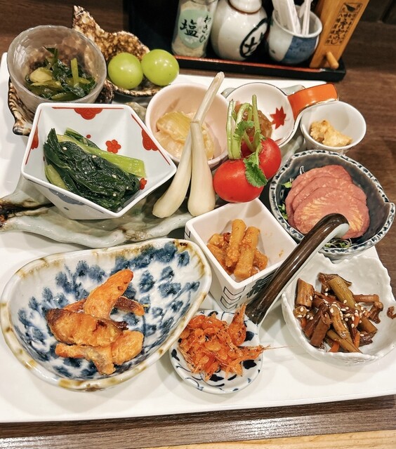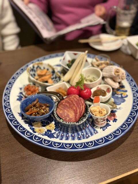 予約した時間に行くと、店内はほぼ満席でした。メニューを見ると、山賊焼や馬刺し、マスのお刺...