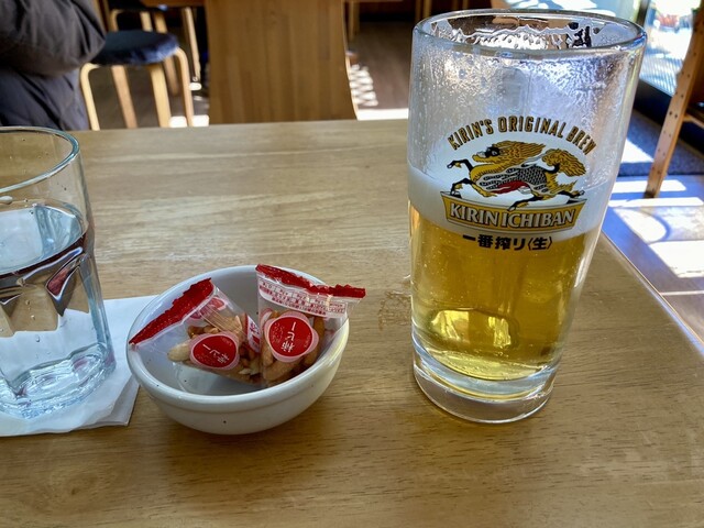 待つ事数分来ました生中そしておつまみに柿ピー、早速乾杯でゴクゴクと飲めるのは列車旅の醍醐味程なく焼きそばも来ました、太麺でボリューム満点、すると別の城友さん4人が来店