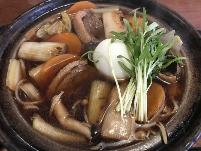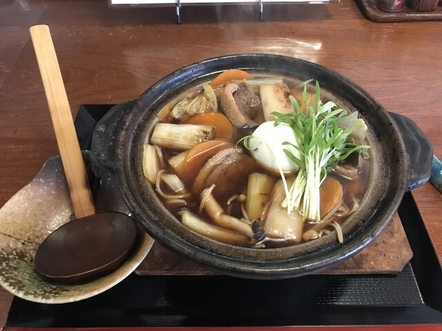 店内は松本民芸調の落ち着いた感じ、今回は鴨汁土鍋そば:1,550円なるの一択で注文しました。一言で言うとなべ焼きうどんの蕎麦版で、汁は鴨汁になっています。見た目通りで具...