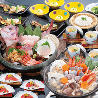 《鍋に刺身、寿司、天布羅。人気の逸品が揃い踏み》 注目は、当店が誇る厳選された海鮮素材を贅沢に使用した「海鮮鍋」。海鮮を中心に野菜など全19種の具材を盛り込んだ鍋はまさに極上。さらに、蟹とフカヒレの茶碗蒸しや、鮪と雲丹の寿司、ふぐ料理も入って、この価格。贅の極みを堪能できます。しかも、料金には樽生ビールを含む飲み放題料金も込みです!