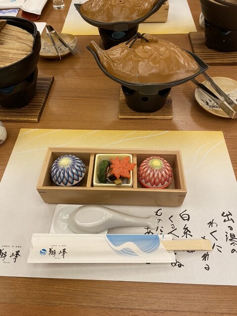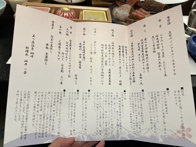 松本市の美ヶ原温泉郷にある大きなホテル翔峰さんにて会席料理をいただきました。先付は、手まりが有名な松本市なので手まりの器に入っていて季節の野菜、お造り、信州牛、信州ポークをあさりときのこ、口直しに桜を...