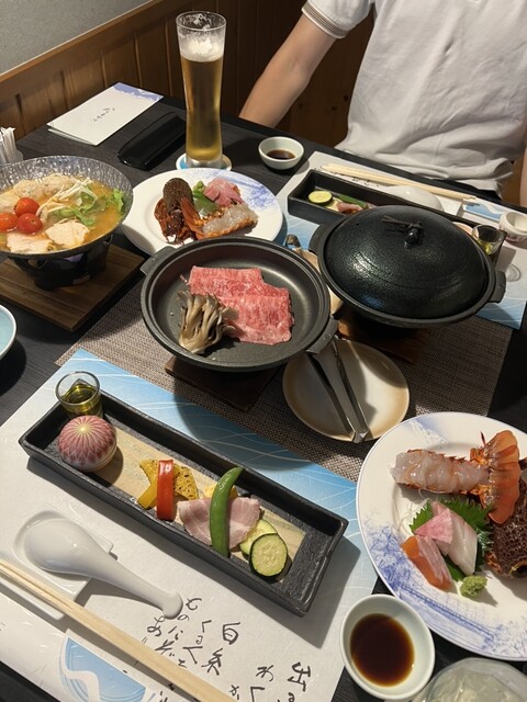 特上懐石料理を頂きました。伊勢海老のお造り、信州豚のしゃぶしゃぶ、信州牛の焼きしゃぶ、鮑の蒸し物と本当に豪華なラインナップでした!どれも料理は美味しく、個室で会席料理を頂けたので大満足です。お部屋もと...