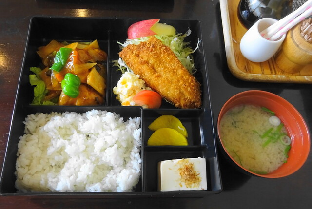 お店前に本日のランチメニューの表示(魚フライとチキンのスブタ風) イージーリスニングのBGM ランチの魚フライとチキンのスブタ風(700円)をオーダー 魚フライとチキンの... 詳細を見る