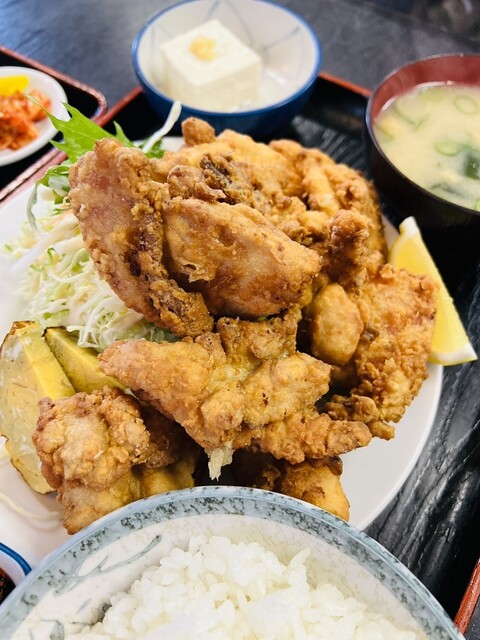 7個ほどの大きなから揚げ、サラダ、たまご焼き、