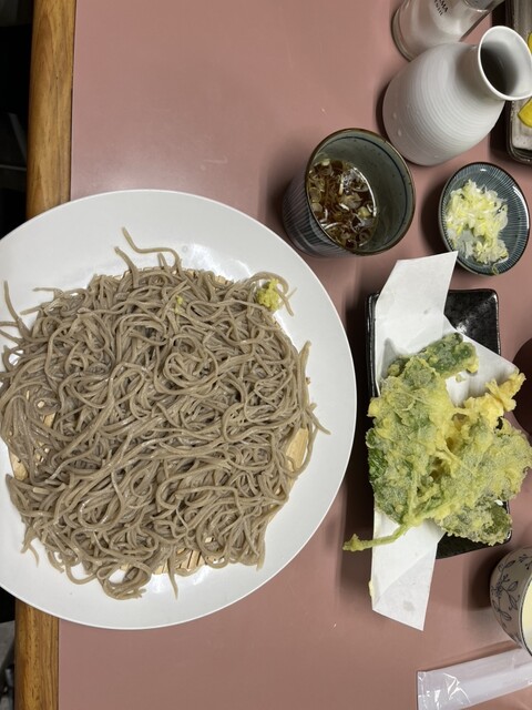 天ぷら蕎麦250g、皆でシェア用に南蛮、馬刺し、鴨鉄板...