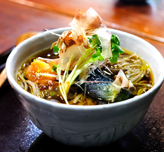 そばつゆは利尻昆布、大分県産椎茸、枕崎産本枯節、枯宗田節を使用する分を削ってから使用しております。