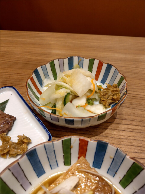 小さめのビピンパ丼、トッポギ、牛タンサラダ、辛味カルビ、チヂミ、そこにワカメスープか味噌汁がついて、税抜1380円。価格的には妥当なところですが、カルビのお肉が硬めで噛みにくかったり、サラダの牛タンが紙のように薄くて満足感につながらず少...