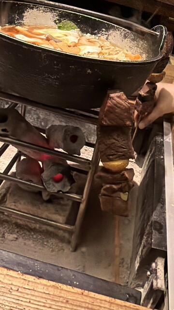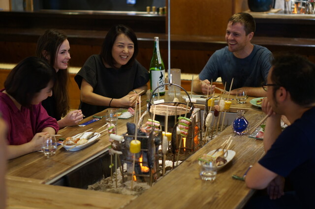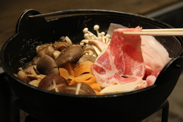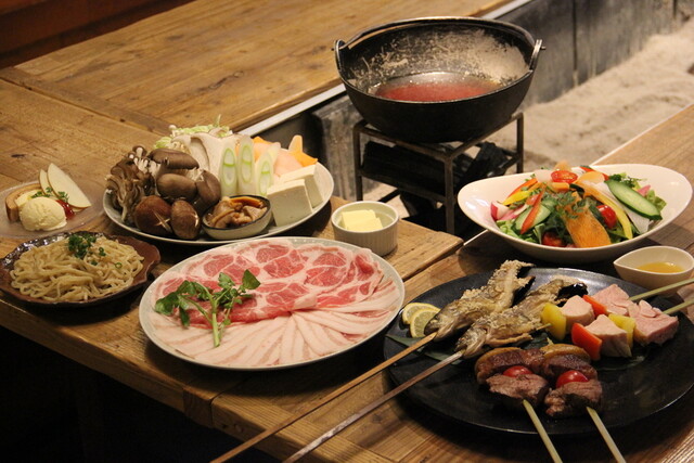 和牛や白馬ポーク、信州サーモンなど地元食材を使った串焼きや鍋料理を、囲炉裏を囲んでゆったりと味わえます。