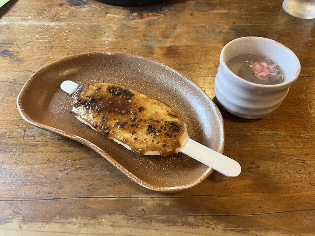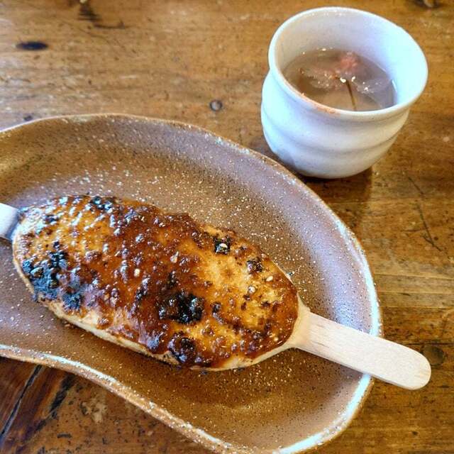 山椒が効いた味噌で味付けされており、今まで食べた五平餅とは全く異なる味、それに合わせるのが珍しい桜湯。
