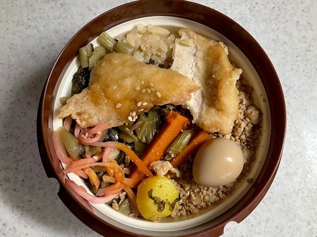 味付けご飯の上には鶏唐揚げ・野沢菜炒め・鶏そぼろ