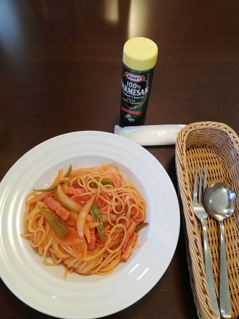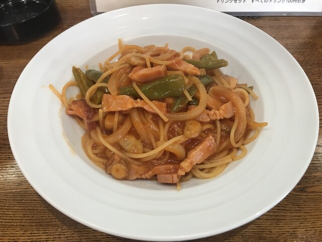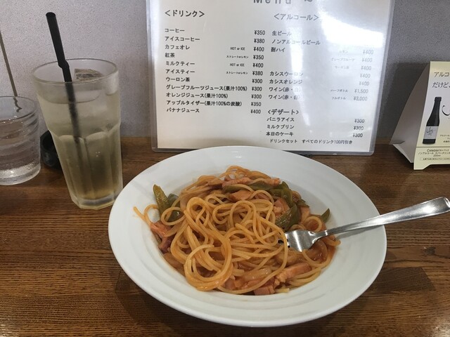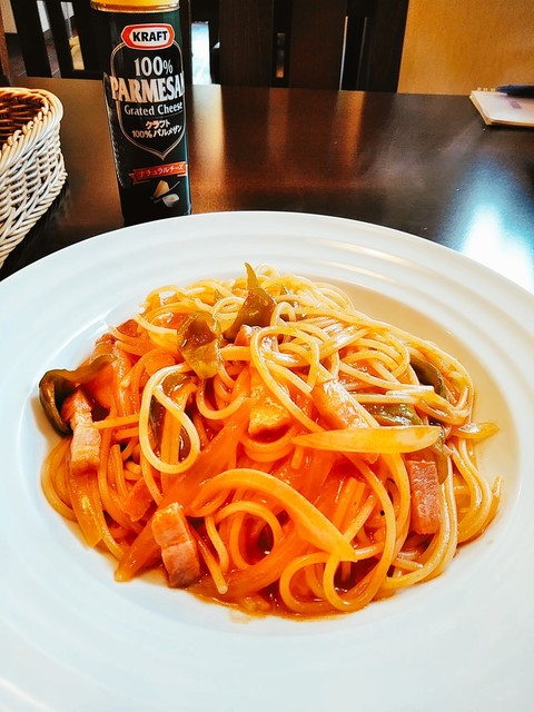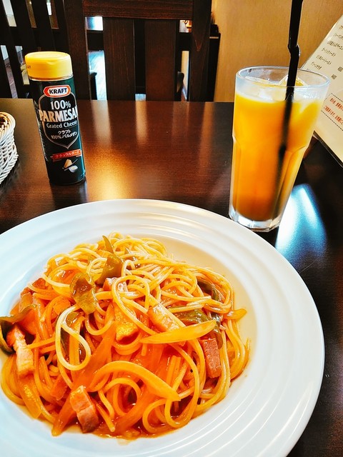 お昼のラストオーダー14:00のところが多かったりでちょっと昼食空ぶってしまいつつお腹も減っていて、こうなると通し営業の喫茶店が俄然便利、えんぱーくの近く、立体駐車場のある南側街区にひっそりとある喫茶店のこちら。なかなかにフードが充実していて訪問。デミグラスソースの信州ポークソテーにも惹かれつつ、そこまでお腹空いてなくて、ナポリタン:800円に自家製ジンジャーエール:400円を注文しました。