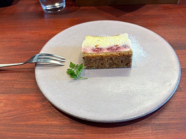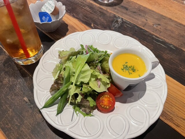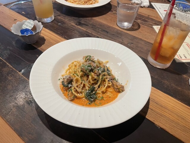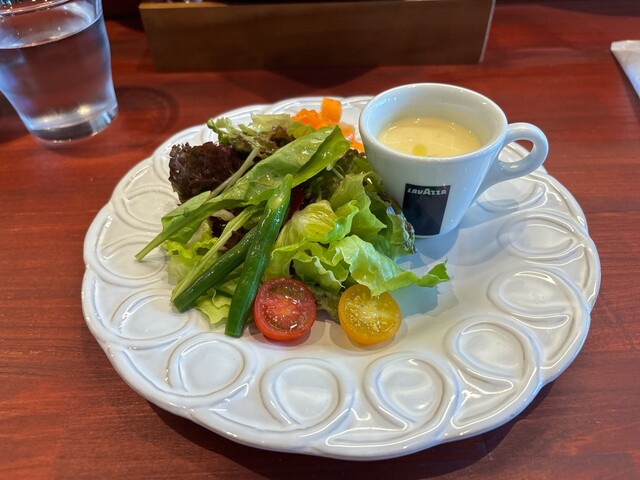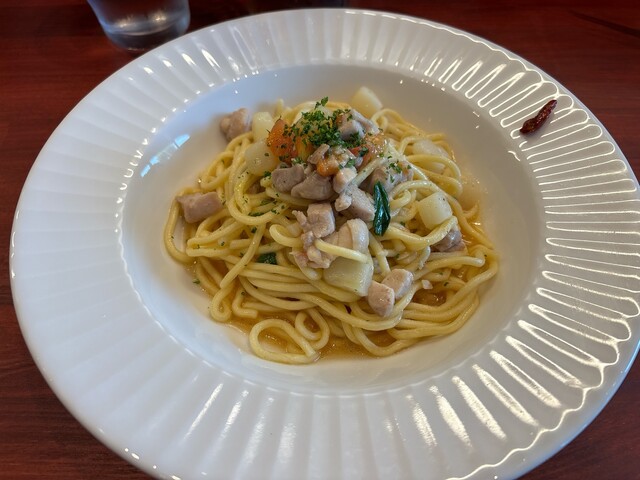 塩尻市の中心街、えんぱーくとか市役所から歩いてもいけます。パパンガ、持ち帰り寿司が入ったテナントビルの居抜き出店、カウンターもテーブルもゆったりしたサイズなので落ち着いて食事できます。今日はランチの訪問、ランチはパスタとスイーツのみ、ちょっとしたサラダ、ドリンクのついたパスタランチ:1,600円にベイクドチーズケーキ:500円を別に注文しました。