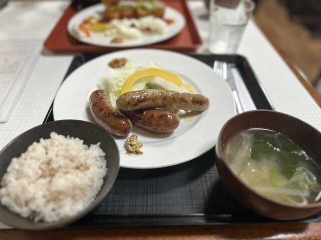 風情ありすぎの店でこだわりソーセージを味噌汁と玄米飯でいただく