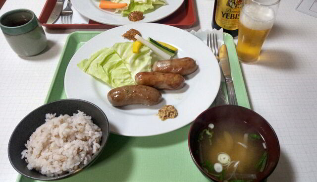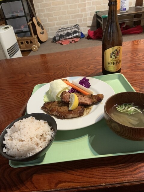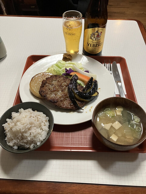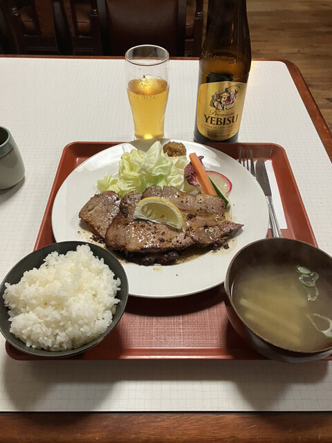 この日はこちらで人気メニュー(多分)のハムステーキ定食1500えんといつものエビス中ビン700えんを発注しました。