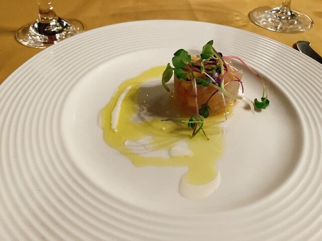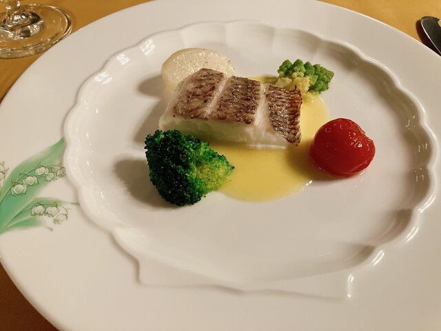 前菜は、長野県産信州大王イワナのマリネと柿のマリアージュ。こうして料理にフルーツを使うとフランス料理という感じがします。スープの後は、魚と肉のダブルメインです。
