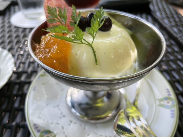 9月頭だけれど、流石の軽井沢。爽やかにテラスでいただくことができました。ババロアが美味しかった!