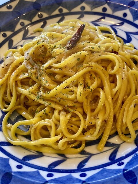 は黄色がかった平打ち麺。アンチョビの塩味と