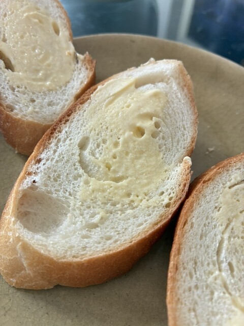 バゲットを切ってる側から試食会の始まりです。一つ食べたら止まりません笑