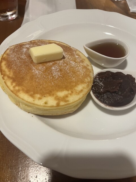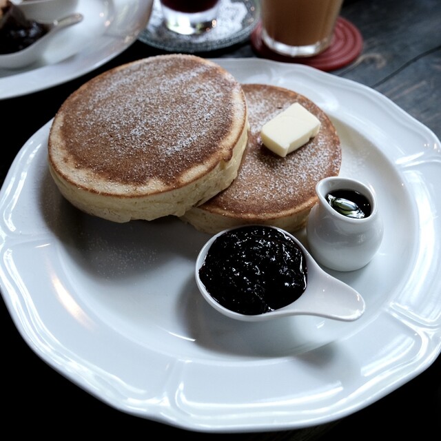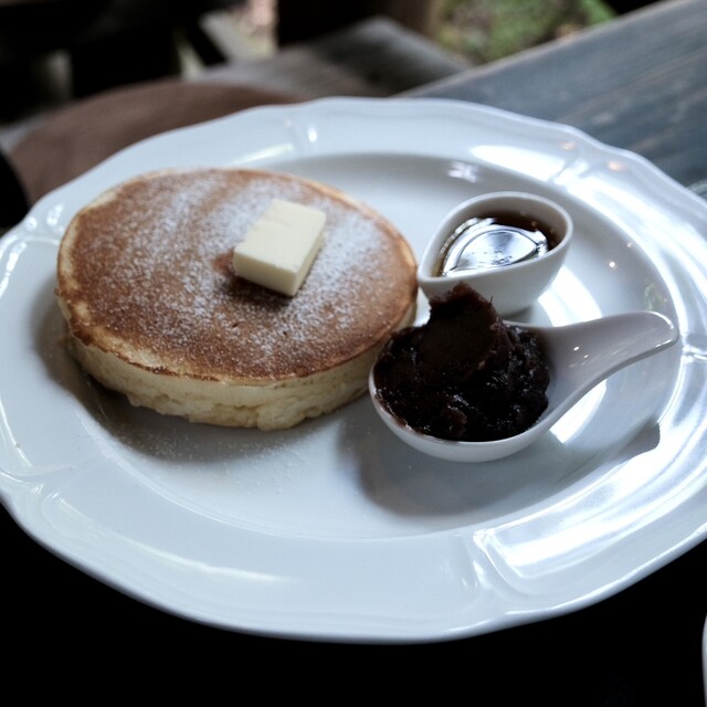 ジョン・レノンお気に入りの外の席でパンケーキとコーヒーいただきました。セルクル使って厚く焼いたパンーキは1枚、2枚を選べて、付け合わせはあんことジャムのどちらか。落ち着いた雰囲気です