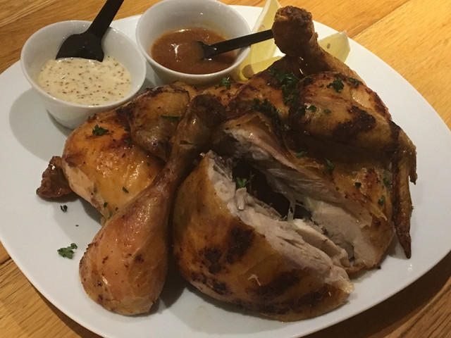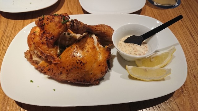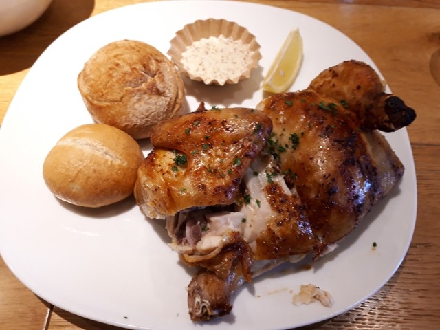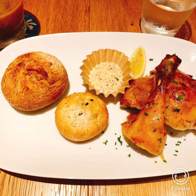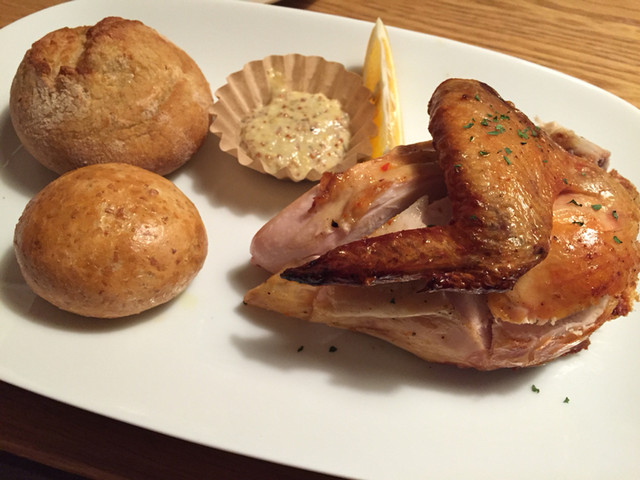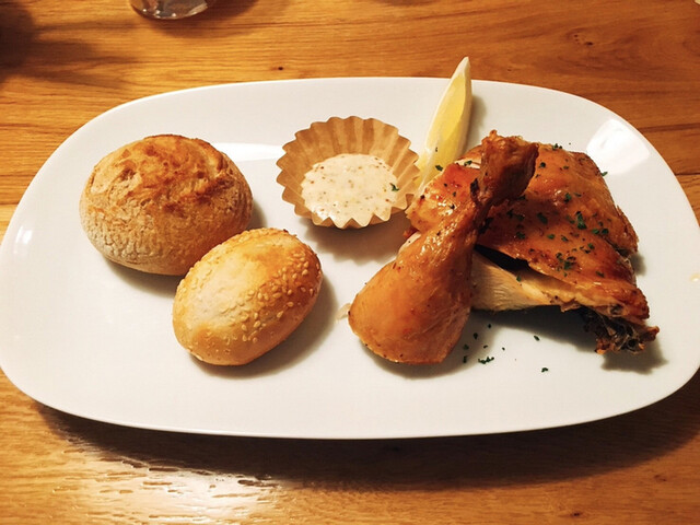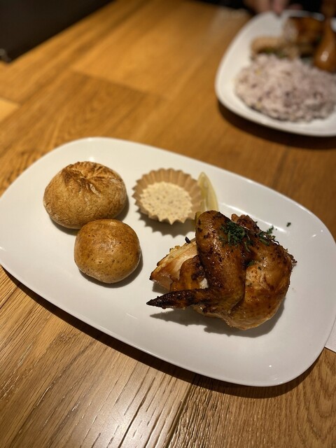 名物ローストチキンSのランチセットを注文、SとLがありますが、Sでも充分なボリューム。表面のパリパリ食感と肉厚な身の部分のバランスがよく、美味しい。チキン用の別添えソースがパンを選ぶと、マスタード系、...