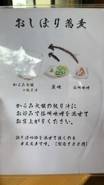 まず【おしぼり蕎麦】とはからみ大根の絞り汁にお好みで信州味噌を混ぜて食べる蕎麦。搾り汁はしっかりからみ大根の風味がして好きな人には満足度◯。