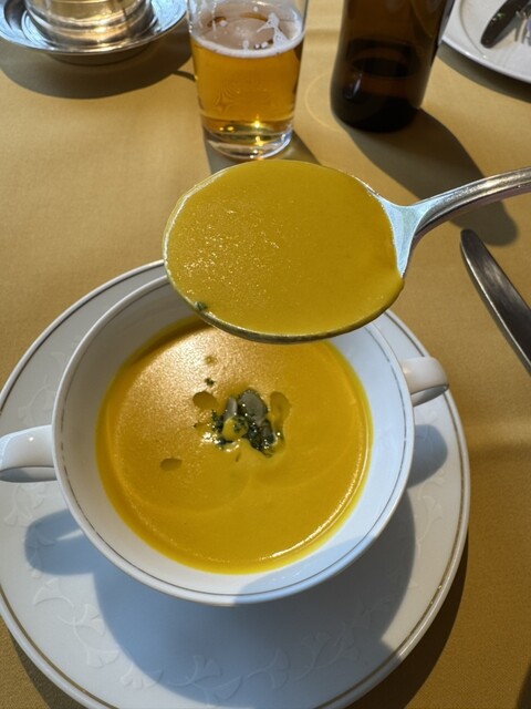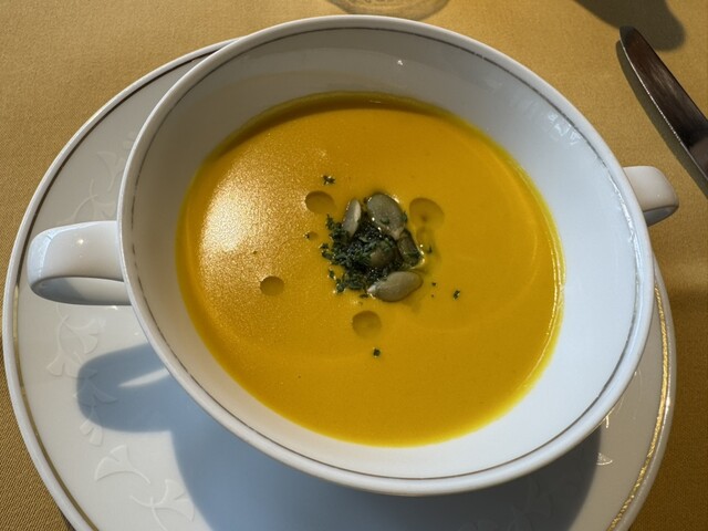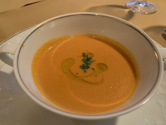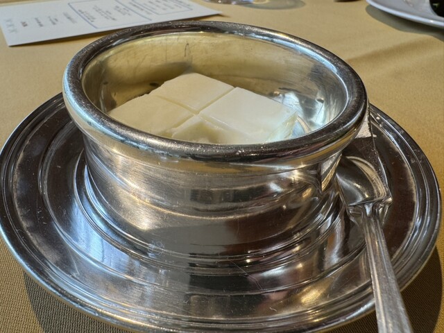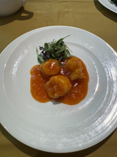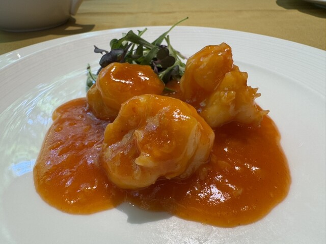 さてさて、ランチメニューはアラカルトのほか、コース的なAランチ(税込5200円)、Bランチ(税込6500円)があり、大きな違いはAはスープが「蟹肉入りとうもろこしスープ」に対してBは「蟹肉入りフカヒレスープ」、メインがAランチは「和牛肉のやわらか煮込み」に対してBランチは「大海老のチリソース煮込み」。…海老好きの僕としてはやはりここはBランチをチョイス。