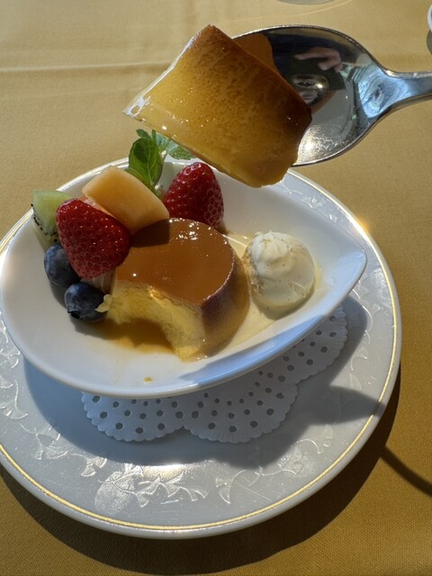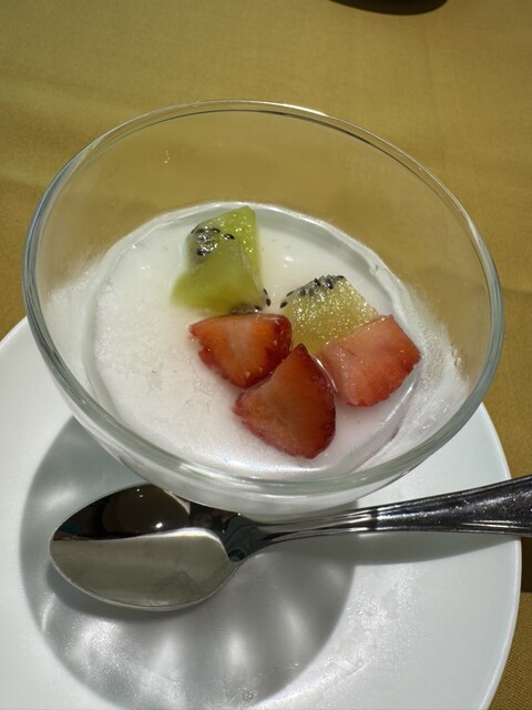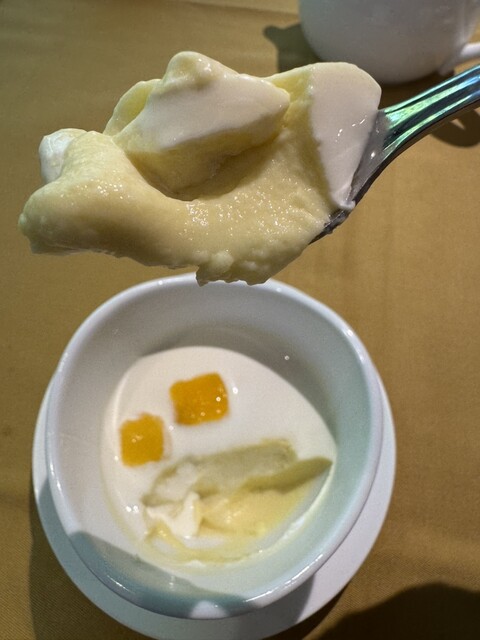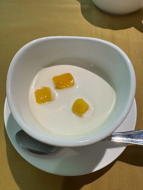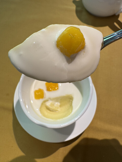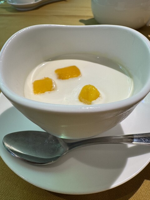 相方は「杏仁豆腐」をチョイス。僕は「マンゴープリン」をチョイス。…二層に分かれていて下層がマンゴープリン。上にはクリーム状のものがかかっていて全体に美味しい。マンゴーの果肉も数片乗っているのも嬉しい。