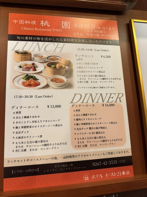 毎年、夏に軽井沢「ホテル鹿島の森」のコンチネンタルルームにて食べることの出来るホテルイースト21東京(東京東陽町)の中国料理『桃園』のランチを予約して食べに行ってみた。