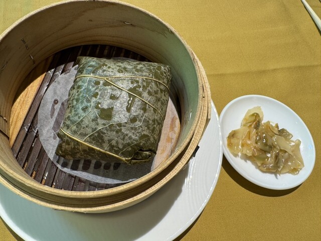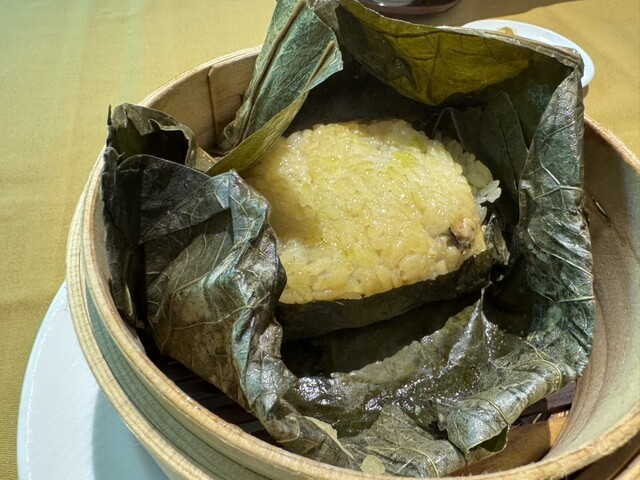 ❺-①「もち米と五目の蓮の葉包み」…相方はこちらをチョイス。少しだけシェアしてもらい食べたが、餅米のもちもち感と味付けがなかなか美味しい。