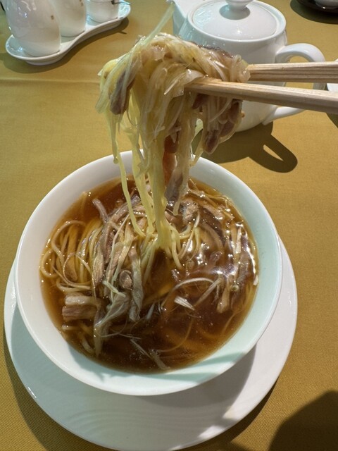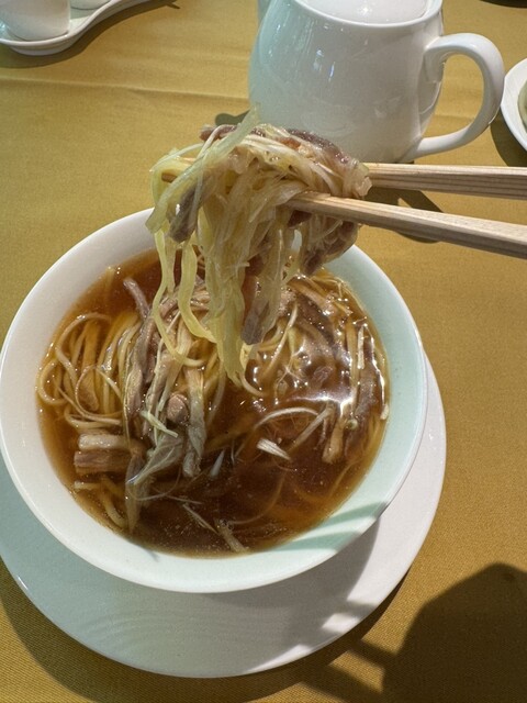 ❺-②「チャーシューの細切り入りねぎそば」…高級中華にありがちの少しスープはぬるめ。チャーシューとネギのコンビネーション、麺のスープへの絡み方はグッド。ホワイトペッパーをたっぷりかけていただく。味わいはなかなか美味しい。メニュー構成的にも自信がある感じのする一品。