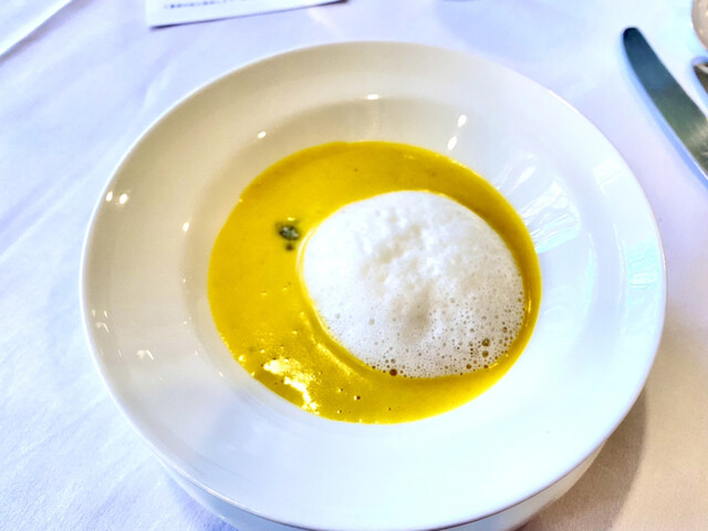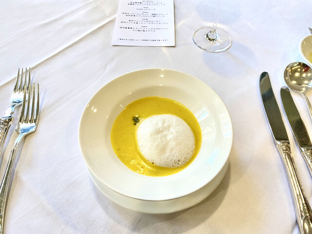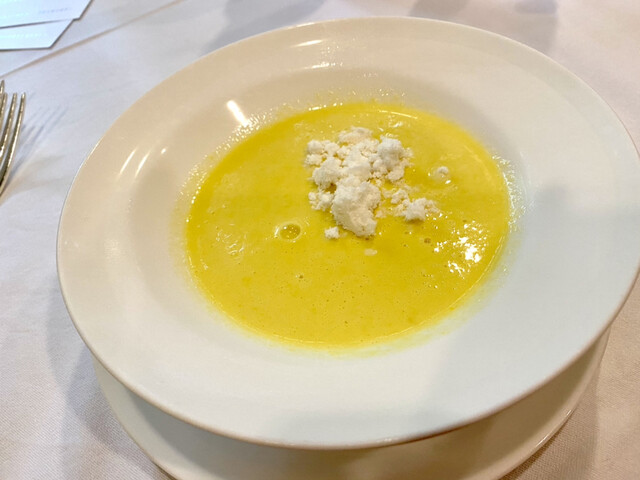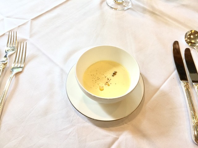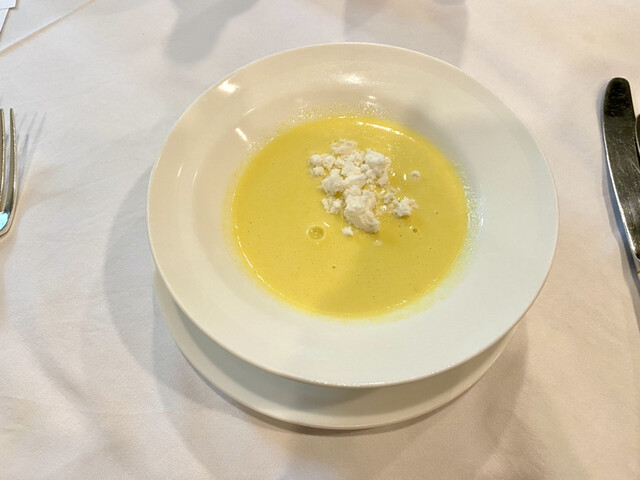 ・冷製とうもろこしスープ、ヘーゼルナッツオイルのパウダー