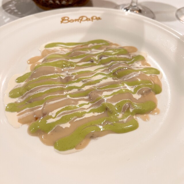 海の幸のマリネはソースで覆われた中に貝や色々な魚が入っています。交互にかけられた淡い緑と茶色のソースは辛子が入っているのか少しピリッと、もう美味しすぎて、、言葉が出ません。